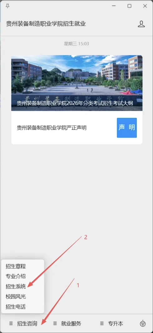 一、微信扫码关注学院服务号“贵州装备制造职业学院招生就业”。